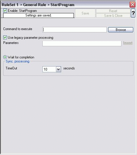 With this, an external program can be run. Any valid Windows executable can be run. This includes actual programs (EXE files) as well as scripts like batch files (.BAT) or VB scripts (.vbs). Start Program can, for example, be combined with the service monitor to restart failed services.
