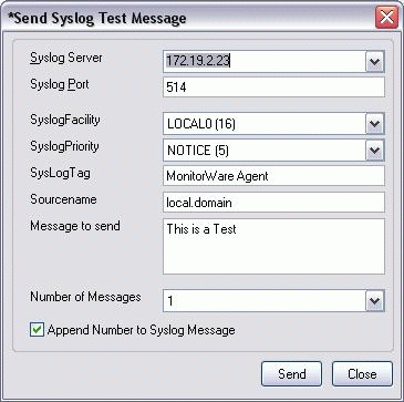 MonitorWare Agent client comes with Send Syslog Test Message. This option enables to check if syslog messages being sent properly to the destination or not.