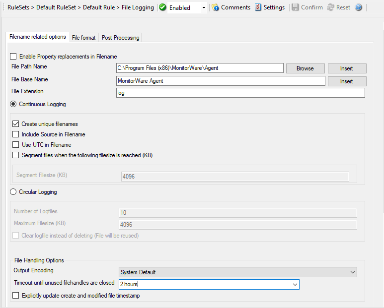 This configuration dialog is available both in the defaults section as well as with file logging actions.