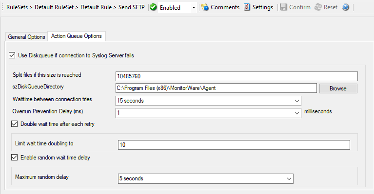 Please Note: The SETP port configured here must match the port configured at the listener side (i.e. MonitorWare Agent or WinSyslog Enterprise edition). If they do not match, a Send SETP session cannot be initiated. The rule engine will log this to the Windows Event Log.