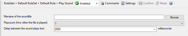 This action allows you to play a sound file. Since Windows VISTA/2008/7, Microsoft has disabled any interaction between a system service and the user desktop. This includes playing sounds as well. So if you want to use the Play Sound Action on any of this Windows Version, you will need to run the service in console mode (From command prompt with the -r option).