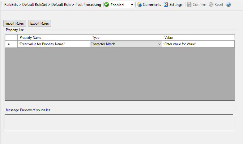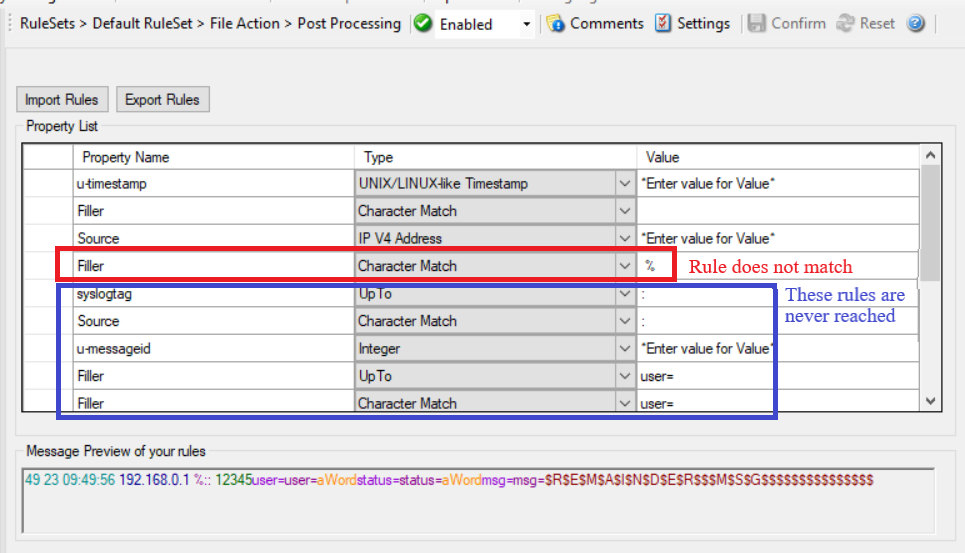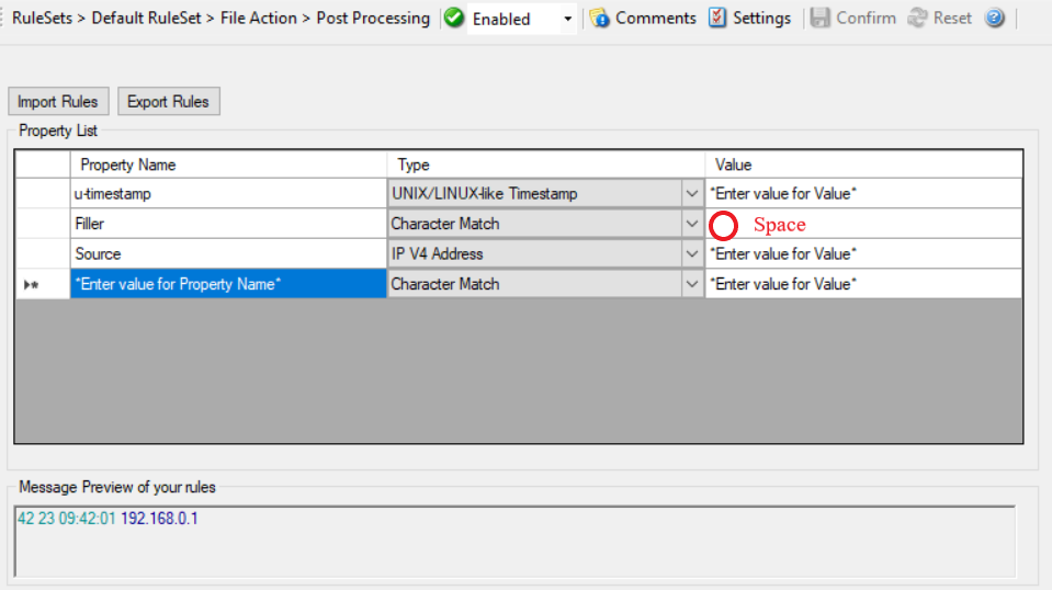 Post-Process Editor: Note the value of ‘Character Match’ rule is a Space*