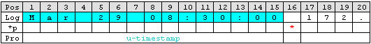 The first identified item is a so called Unix/Timestamp. It has always a length of 15 characters. ‘UNIX/LINUX-like Timestamp’ parse type exactly covers the requirement to parse this item. Therefore insert a rule and select ‘UNIX/LINUX-like Timestamp’ type. This rule parses out the timestamp and moves the pointer to the next character after the timestamp. Name the property ‘u-timestamp’ [1].