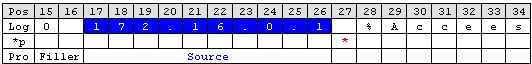 Next item is the IP address. Note that after the timestamp follows a space and then the IP address. Therefore insert a ‘Character Match’ rule with a space as value. Select the ‘Filler’ [2] property for this rule. ‘Character Match’ requires a user defined value. This parse type compares the given value with the character at the current position of the message. The character has to be identical with the given value otherwise the parse process will fail. After applying this parse type the parse pointer is moved to the position immediately after the given value. In our sample this is the start position of the IP Address (Pos 17).