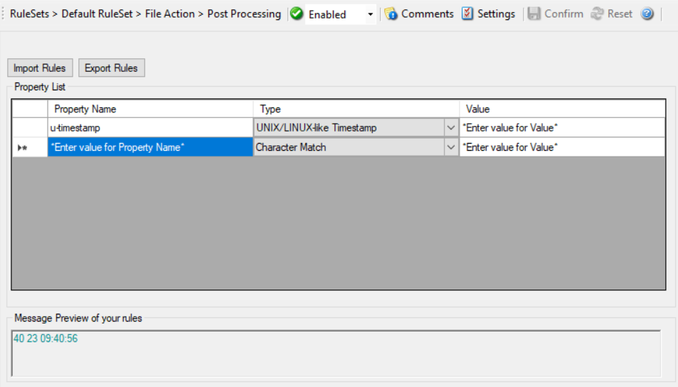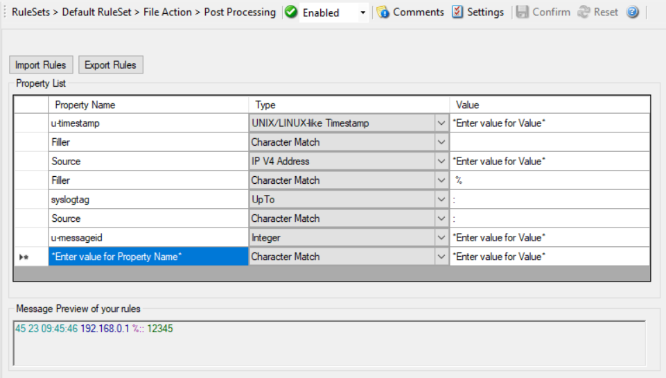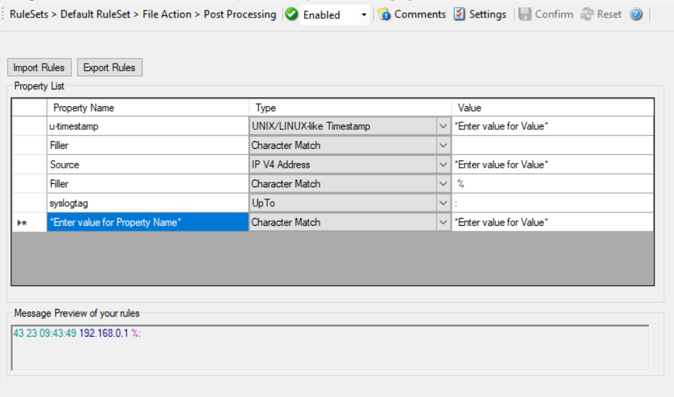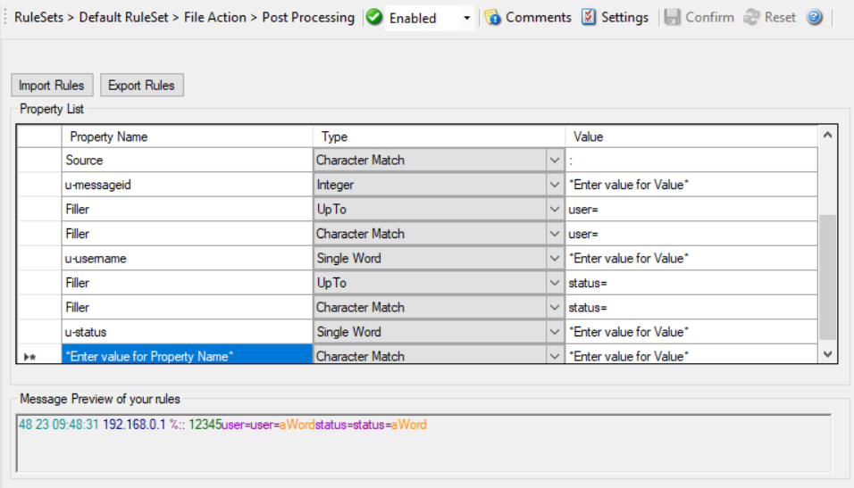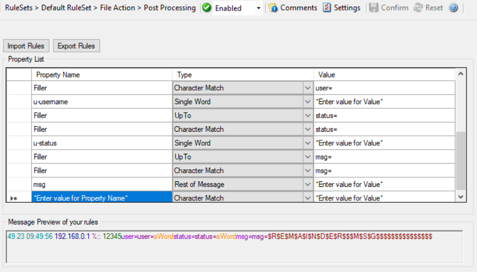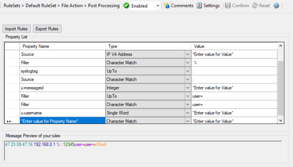 Post-Process action provides an editor for creating a log format template. A template consists of as many rules as necessary to parse out the relevant information.