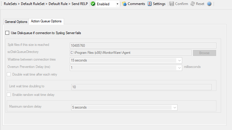 When the Action is processing syslog cache files, an overrun prevention delay can be added to avoid flooding the target Syslog server.
