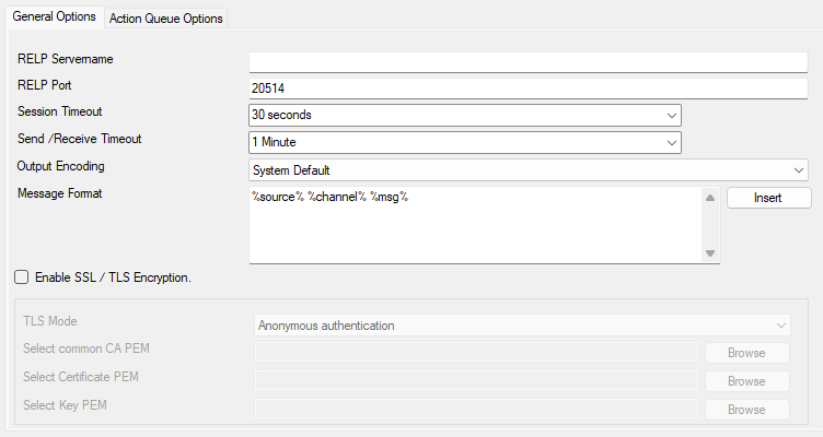 If this option is enabled, the action will use SSL/TLS encryption for secure communication with the RELP server. When disabled, messages will be sent unencrypted. Note that if this option is enabled, the action will not be able to talk to a NON-SSL secured server.