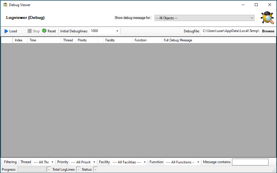 When clicked, a new Logviewer window will be opened. The Debug Logviewer can load, parse, and analyze debug log-files from the service.
