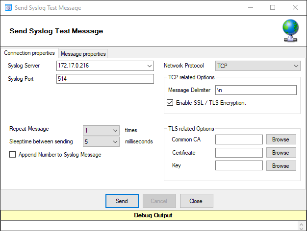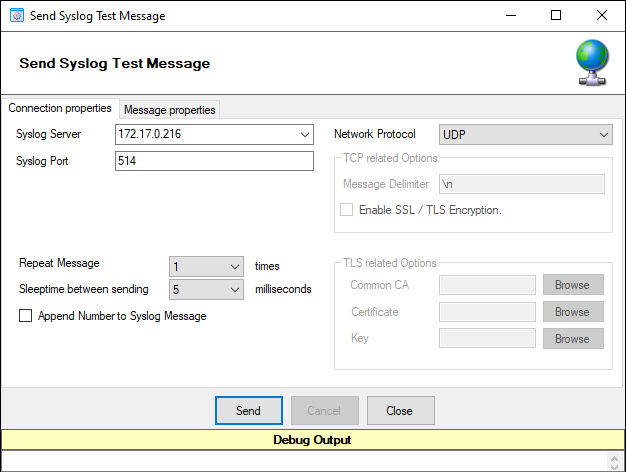 Opens a new windows which can send syslog test messages to Syslog Servers. This can also be opened within the configuration window of a Syslog service.