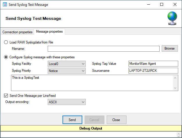 You can choose to load raw syslogdata from file using this option. When loading UTF8 data make sure to set the Output encoding format from ASCII to UTF8. And if your file contains multiple syslog messages make sure that - Send One Message per LineFeed - is checked.
