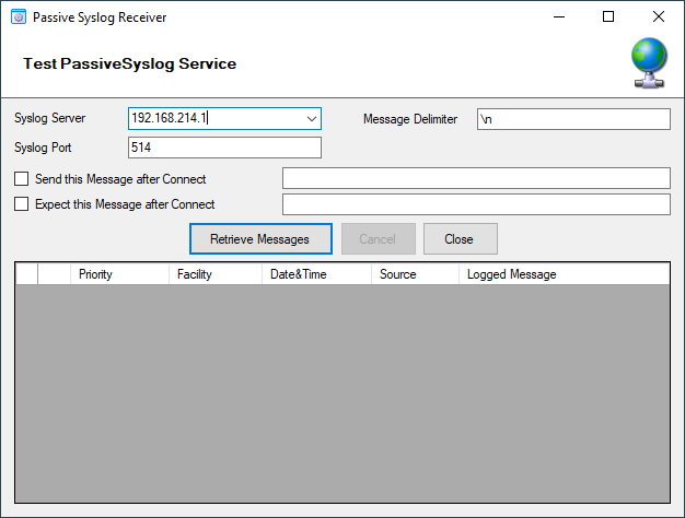 Opens a new windows to test Passive Syslog Servers. This can also be opened within the configuration window of a Passive Syslog service.