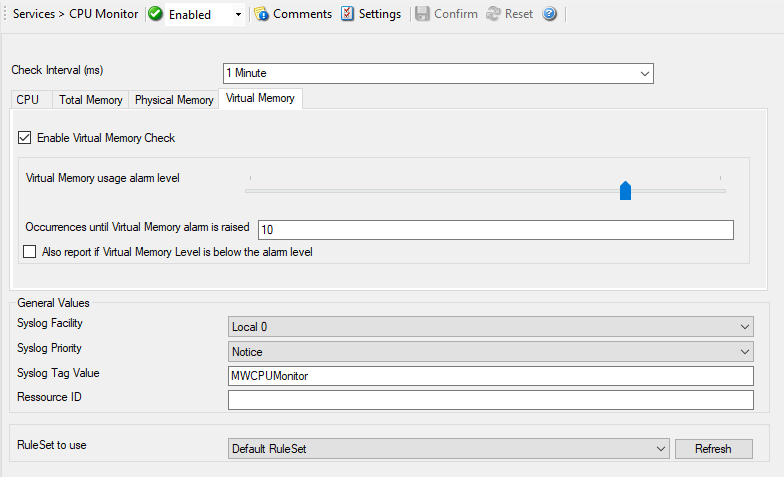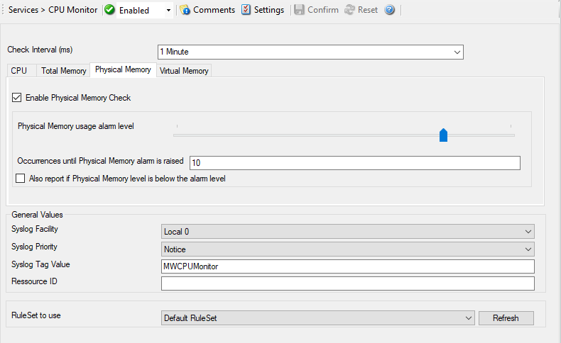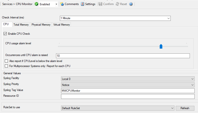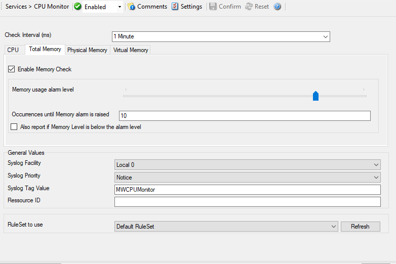 The CPU/Memory monitor has two parts of monitoring, a CPU and a Memory part. Both parts are checked frequently in a specified check interval. By default this interval is configured to 60 seconds so a check is done after every 1 minute. Both CPU and memory part can be disabled and enabled. The service becomes useless if you disable both parts.