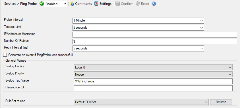 The ping probe is typically used to check the availability of a remote system. The ping probe periodically sends the ping messages. As long as responses are received, nothing happens. If no response is received, it generates an event and passes it to the rule engine. As ping messages can get lost, the ping probe retries failed probes before it reports an error. Both the number of retries and the retry interval can be specified.