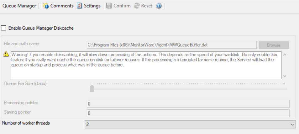 The diskcache will not cache infounits from services like EventLog Monitor, as this kind of Service only continues if the actions were successfully. All other information sources like the Syslog server will cache its messages in this file. If the Service or Server crashes for some reason, the queue will be loaded automatically during next startup of the Agent. So messages which were in the queue will not be lost. Only the messages which was currently processed during the crash will be lost.