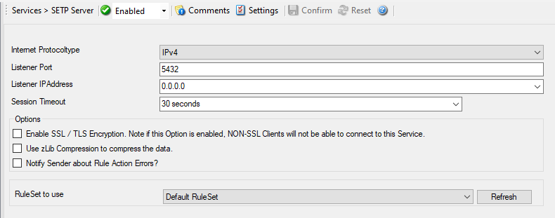 The SETP server service can be bound to a specific IP Address. You can either use an IPv4, an IPv6 Address, or a Hostname that resolves to an IPv4 or IPv6 Address. This feature is useful for multihome environments where you want to run different Syslog Servers on different IP Addresses. Please note that the default IP Address 0.0.0.0 means ANY IP Address.