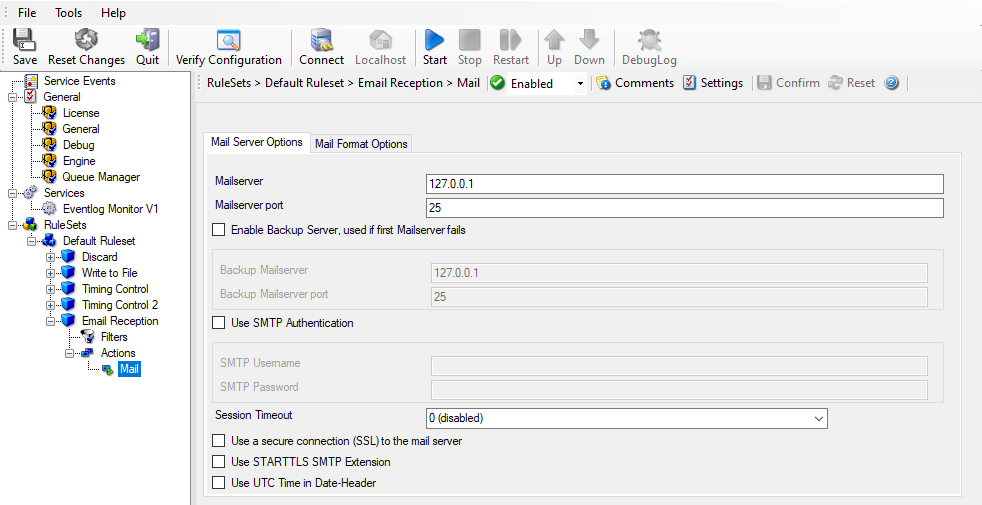 In the action details, be sure to configure at least the mail server, recipient and subject properties.