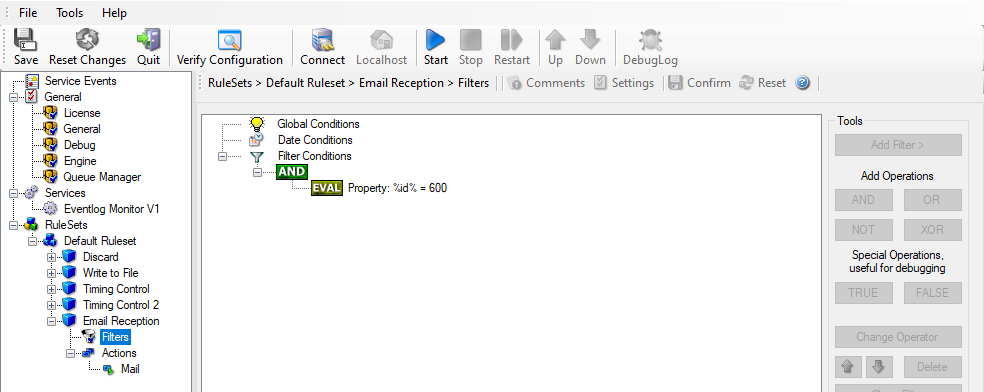 When you have finished these steps, be sure to save the configuration and restart the MonitorWare Agent service. After the restart, the newly extended ruleset is executed. In addition, the rules defined so far, the new one is carried out, emailing all events with ID 600 to the specified recipient.