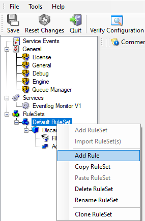 To do so, right-click the “Defaults” ruleset as shown below. Then, select “Rules” and “Add Rule”: