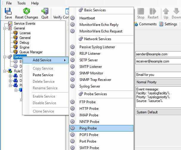 A ping probe service can monitor a single device in this version of MonitorWare Agent. Therefore, if you would like to monitor multiple devices, you need to create multiple ping probe services.