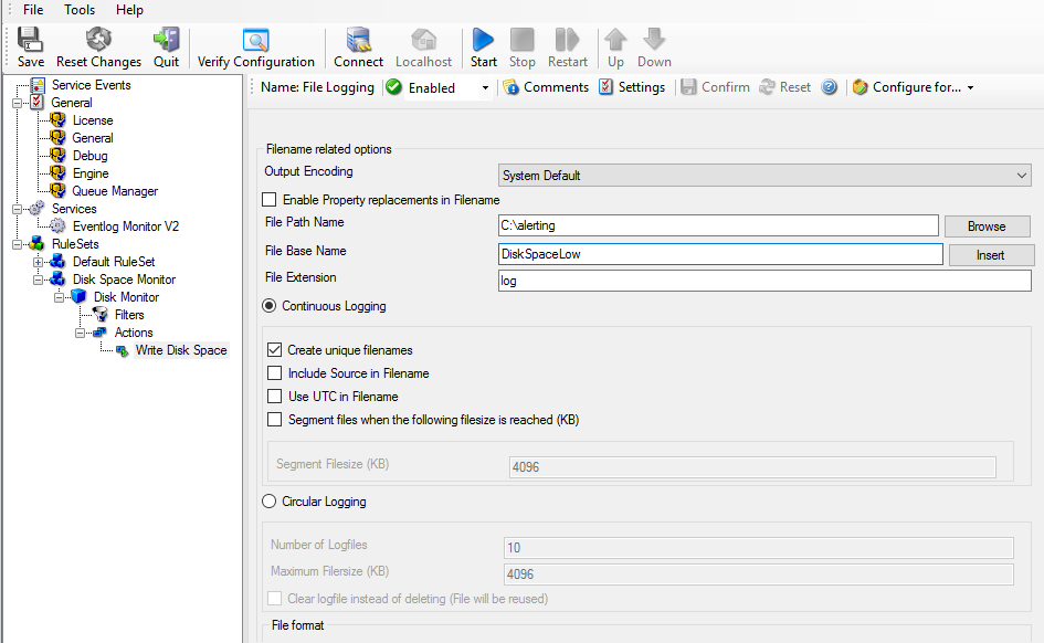 We name the service “Disk Space Monitor” in our sample. Leave the default settings. Please note that when you select the new service, it is typically bound to the “Defaults” ruleset. We need to change this, as we have created the specific “Disk Space Monitor” ruleset. Change the “RuleSet to Use” to update it to the new binding.**
