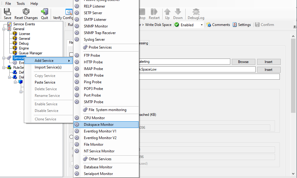 Having created the new ruleset, we now need to create the disk space monitor service itself. It is the part of the software that actively goes out and monitors the disk space. To create it, right-click “Services” and select “Add Service”. Below “File System monitoring” you find “Diskspace Monitor” as seen below: