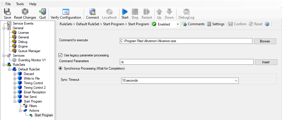 Our sample, on the other hand, is kept quite simple again. We just show how to generically start an exe file. To do so, we define a new rule named “Application starts”. Again, we use the imaginary event 592 as a filter condition. Therefore, the application starts whenever event 592 comes in.