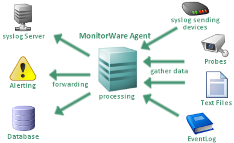 MonitorWare Agent integrates the core functionalities of WinSyslog (one of the first Syslog servers for Windows) and EventReporter (the first tool for Windows Event Forwarding) into a comprehensive solution. While WinSyslog and EventReporter are proven specialists for Syslog collection and Windows event logging, respectively, MonitorWare Agent significantly expands this range of functions.