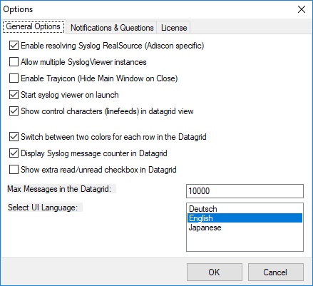 Here you can choose your favorite language for the InterActive SyslogViewer. By default it is english. You can choose german or japanese as well.