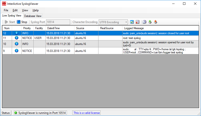 With the start button, you start the receiving service. Now the InterActive SyslogViewer will receive and display all incoming messages. If messages were sent before starting the service, they will be dropped.