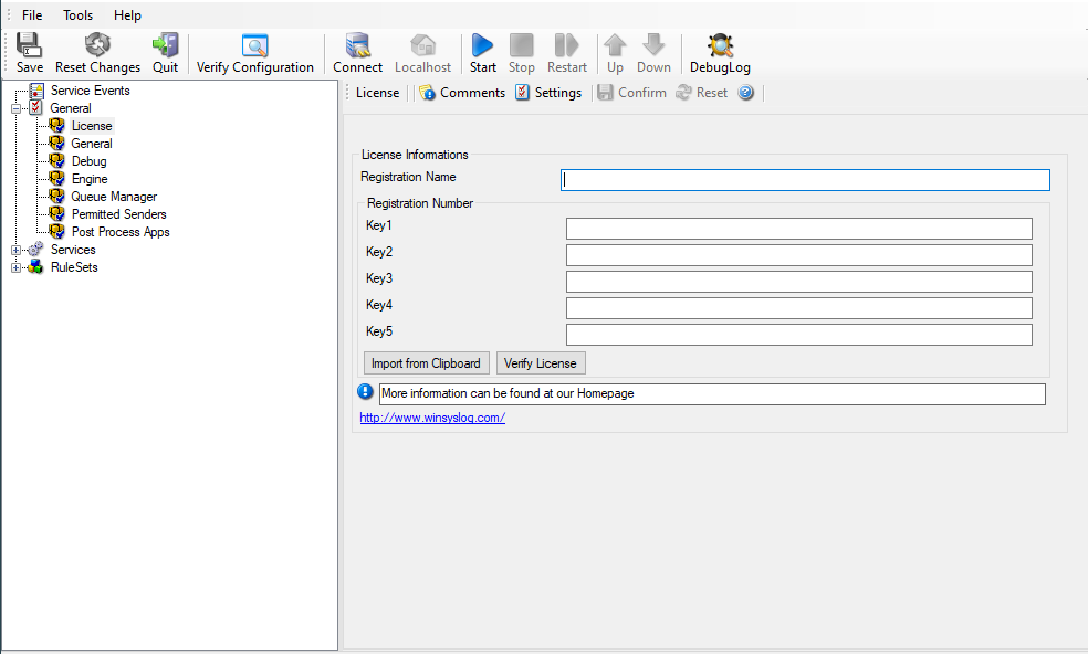 The license screen can be found on the left side of the client under the item General. Applying the license is very straightforward with only a few steps. After purchase, you will receive an email from us that contains the license name and key.