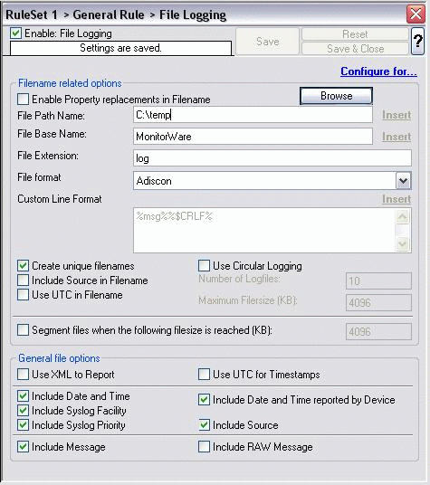 All incoming events – no matter what source they came from – can be stored persistently. Options include archiving in databases as well as log files. File logging is used to write text files of received messages. One file per day is written. New entries are appended to the end of the file.